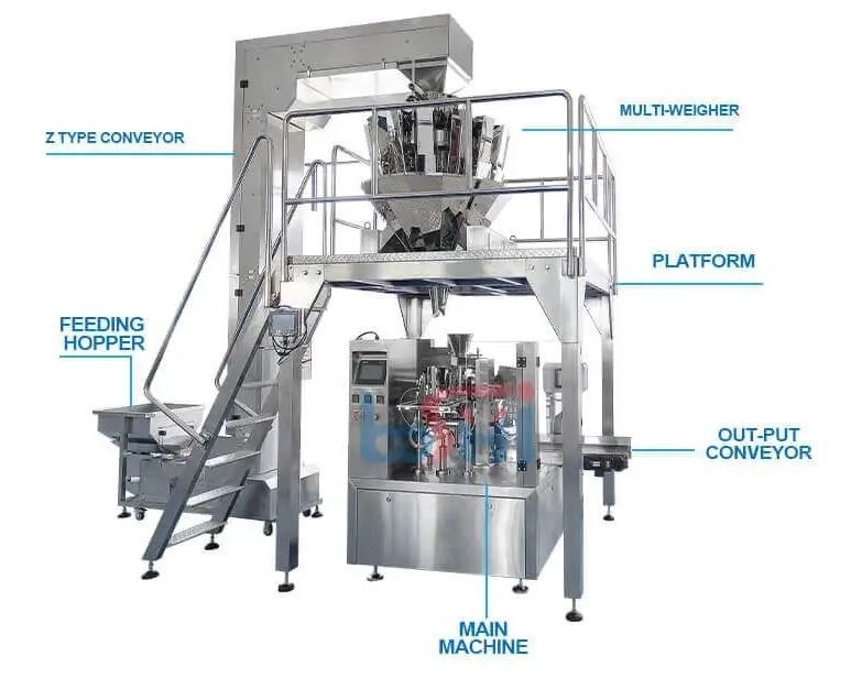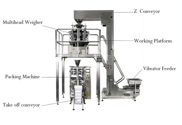 Multihead Weigher: Positioned above the working platform, this weigher ensures accurate measurement of product quantities, optimizing packaging precision and reducing waste.
